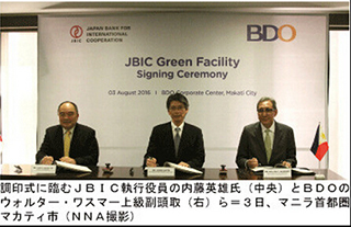 8月3日,JBIC银行和菲律宾最大金融银行BDO签订5000万美圆的融资框架和谈。经过BDO,以可再生动力为焦点在情况相干营业方面停止融资。刻日是三年。