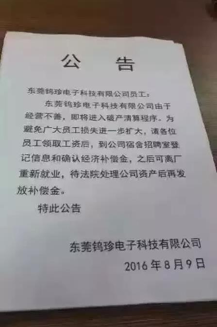 重磅!东莞钨珍电子停业开张网友爆料