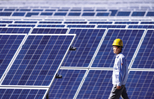 9月5日,格尔木一处光伏电站的任务职员在站内巡检。