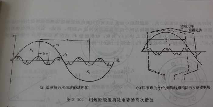 如果把一个的短距线圈放在五次谐波磁场中,由图2.104(b)可见,这时短距线圈的两条有效边恰好处在同一极性(图中所示N极位置)对应的位置上,因此,在短距线圈每条有效边中,五次谐波电势大小相等,而方向相反,对整个线圈而言,两者串联相互抵消,所以该线圈出线端间的五次谐波感应电势为零。同理,取,则可消除七次谐波电势,由此可知,选择适当的线圈节距,就可消除或削弱感应电势中的高次谐波。